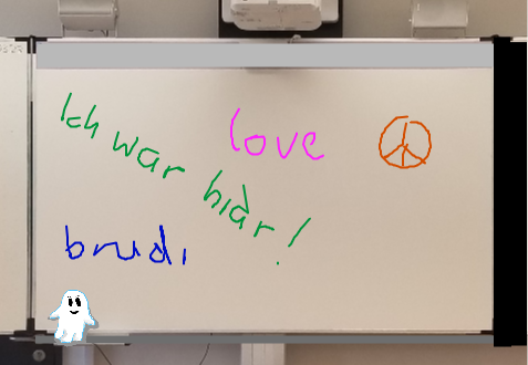 Oh je! Wie sieht nur die Tafel aus. Jetzt aber schnell wischen kleiner Schulgeist, sonst gibt es noch Ärger mit Frau Weger. Du weißt doch: Auf der Mitteltafel darf man nicht schreiben.